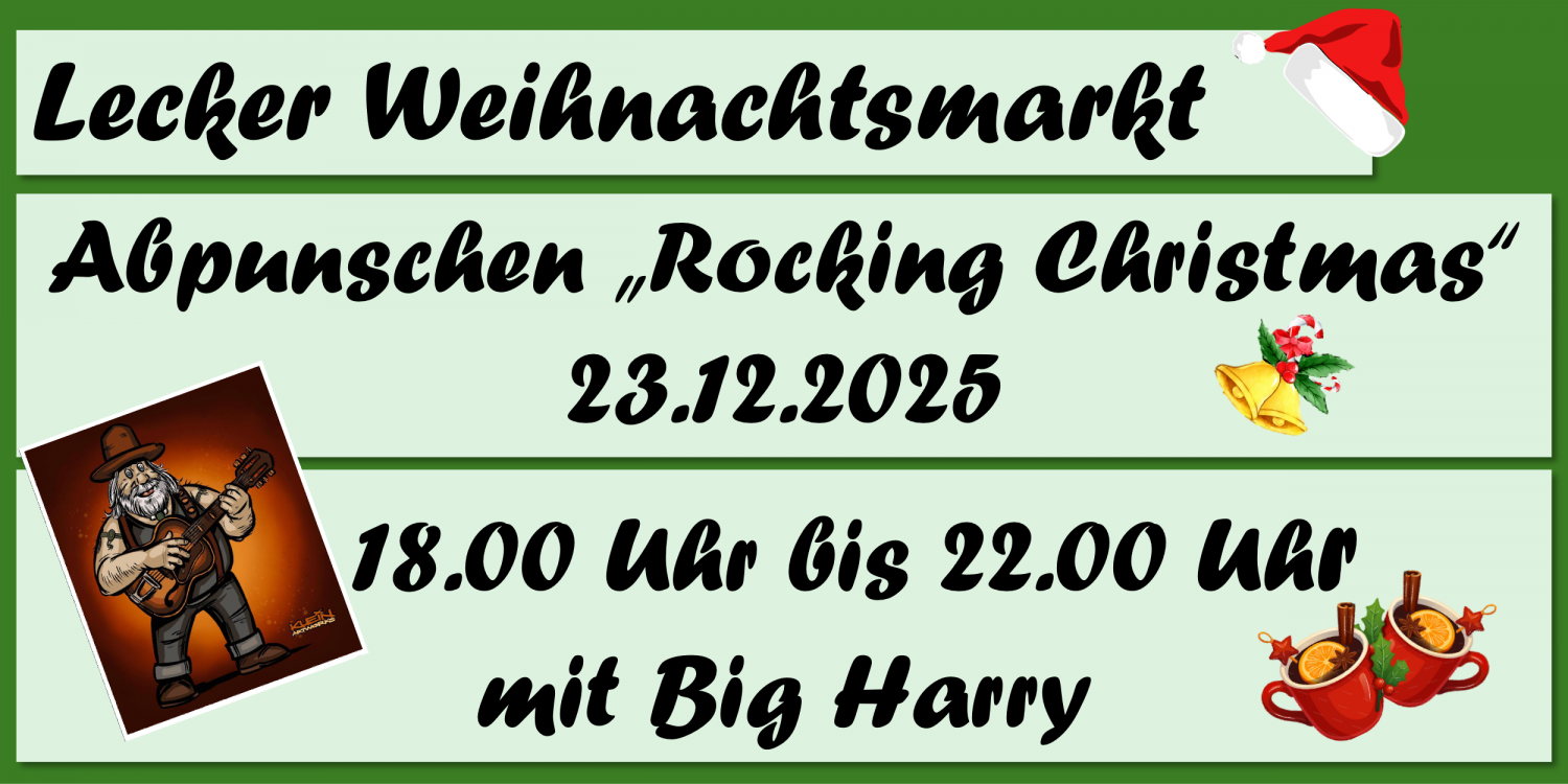 Am letzten Tag des Weihnachtsdorfs könnt ihr von 16:00 Uhr bis 22:00 Uhr vorbeischauen. Freut euch auf unser „Abpunschen“ für den guten Zweck und auf das „Rocking Christmas“ mit Big Harry. 🎄Lasst uns gemeinsam das Weihnachtsdorf gebührend verabschieden – Kommt vorbei und feiert mit uns das große Finale unter funkelnden Lichtern!
