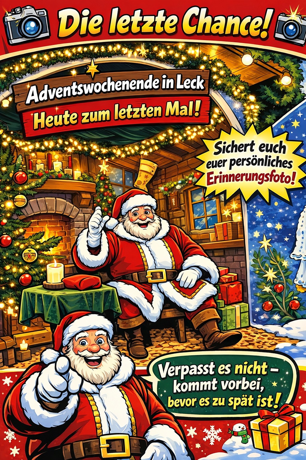 zum letzten Mal habt ihr erneut die Gelegenheit, euch an dem Wochenende mit dem Weihnachtsmann vor der Kamera verewigen zu lassen! 📸🎅 Samstag und Sonntag, in der Zeit von 16.00 – 18.00 Uhr
